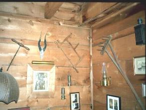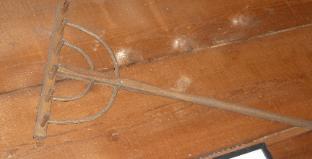 Antique auger (drill), small crossbow saw, and rake